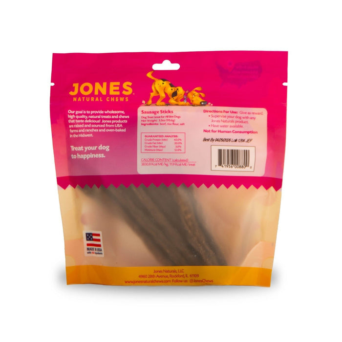 Reward your dog with wholesome, irresistible goodness! Jones Sausage Sticks are perfect for everything from potty training to teaching new tricks—or simply giving a tasty goody. Made from 100% USA-raised beef and oven-baked with just two natural ingredients, these treats are easy to break into pieces for training or snacking. Each stick measures approximately 5" in length, and package counts are approximate based on weight. All Jones Natural Chews treats come from USDA-inspected meat-processing plants, ensuring premium quality.