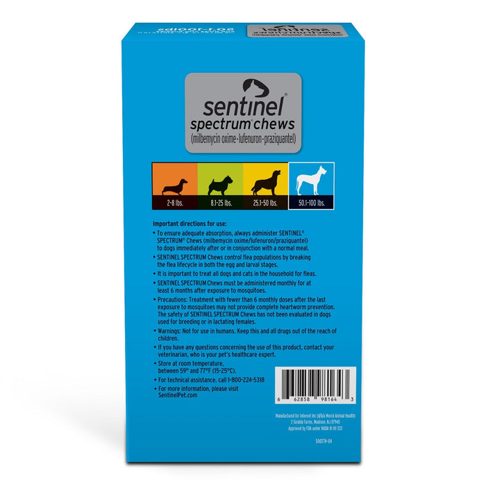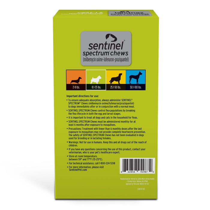 SENTINEL SPECTRUM CHEWS are indicated for the prevention of heartworm disease caused by Dirofilaria immitis; for the prevention and control of flea populations; and for the treatment and control of adult roundworm, hookworm, whipworm, and tapeworm infections in dogs and puppies two pounds of body weight or greater and six weeks of age and older.