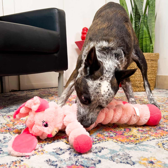 KONG Shakers Crumples’ jumbo size delivers extra-large fun with a long, floppy body great for satisfying shaking, tugging and fetching instincts. A unique grunting squeaker in the body, crackly arms and squeaky feet keep dogs playing. Irresistibly soft plush makes them great snuggle buddies. Thin arms and legs let dogs big and small grab on and enjoy.