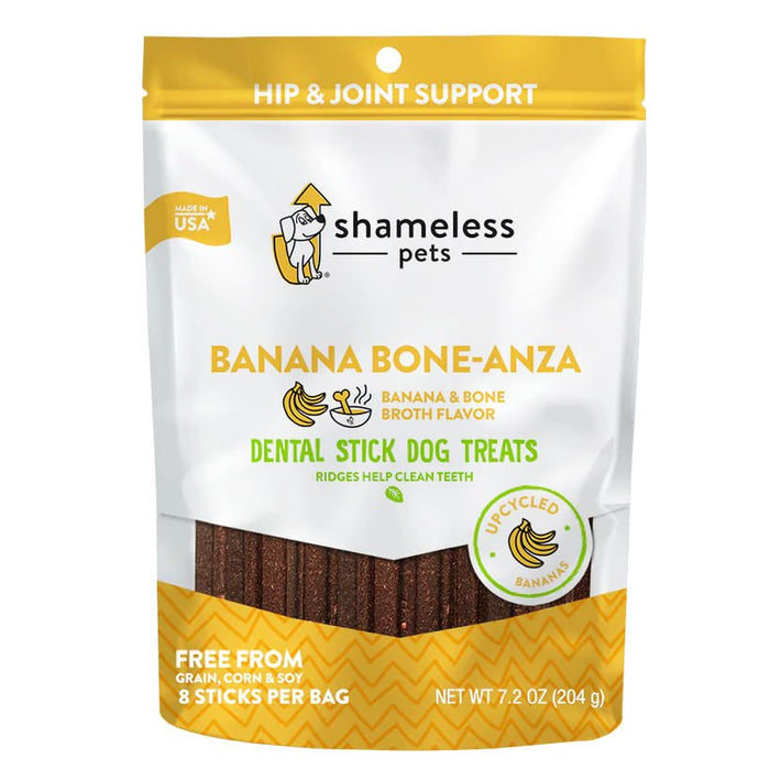 Shameless pets dental treats feature ridges in order to deep clean teeth. Added key upcycled ingredients help support your pup’s total health. Shameless Pets’ selection of healthy sustainable dental sticks contain at least 30% upcycled ingredients. These dental sticks may support several functional benefits including digestion, skin & coat, breath, immune system, and healthy hips & joints.