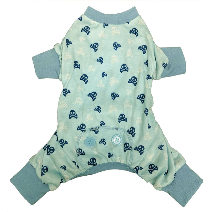 Let your furry friend make a stylish statement with our Skull N Cross Bone Pajamas for dogs. Crafted from a soft interlock cotton blend, these cozy pajamas feature a trendy and fun skull n crossbones design, making your pet look effortlessly cool. The faux back flap with button detail adds a touch of charm and authenticity. Available in a wide range of sizes from XXS to XLG, these pajamas are perfect for dogs of all shapes and sizes, ensuring a comfortable and fashionable fit. Ideal for keeping your pet warm and adding a dash of personality to their bedtime routine.