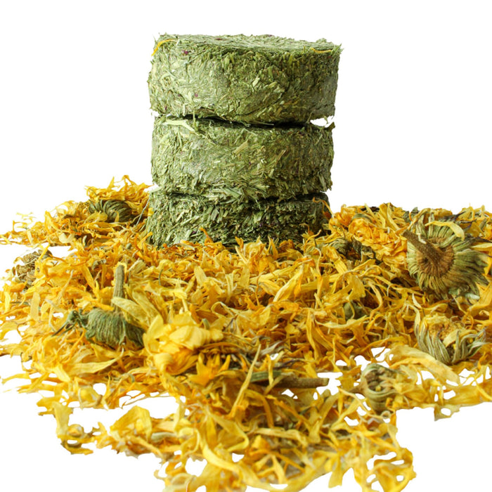 Unlike ordinary hay piles, or unhealthy “treats” full of artificial ingredients, our Timothy Treasures are ingeniously designed to captivate and engage your cherished companions in the healthiest way possible. The remarkable firmness of these rounds encourages them to play, savor and chew, transforming mealtime into a gratifying and stimulating experience. Each perfectly portioned round allows you to effortlessly manage their diet while promoting dental health and overall well-being through enriching all-natural, instinctual play.