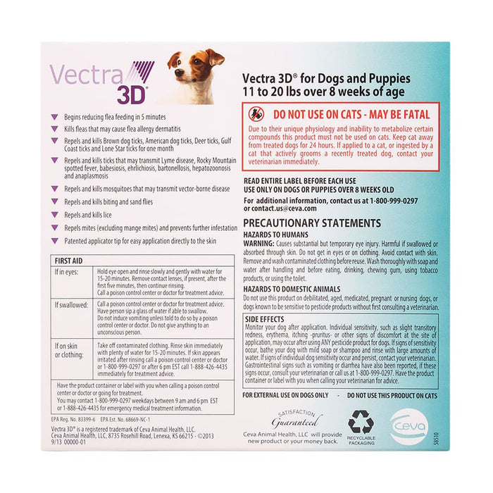 Vectra 3D begins reducing flea feeding in just 5 minutes. This powerful treatment kills fleas that may cause flea allergy dermatitis and effectively repels and kills a variety of ticks, including brown dog ticks, American dog ticks, deer ticks, Gulf Coast ticks, and Lone Star ticks, for up to one month. Vectra 3D also repels and kills mosquitoes that may transmit vector-borne diseases, as well as biting flies, sand flies, and lice. The patented applicator tip ensures easy application directly to your dog's skin.