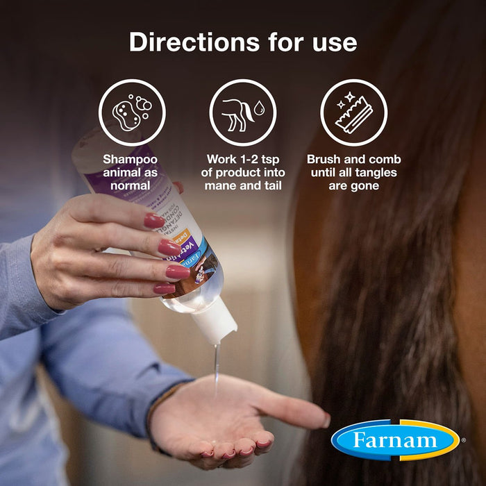 After shampooing, work a small amount (1 to 2 teaspoons) of Vetrolin Instant Detangler into wet or dry mane and tail. Continue to apply small amounts as you brush or comb until all tangles are gone.