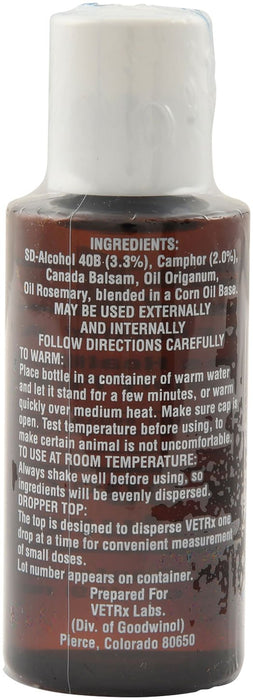 All-Natural VetRx Poultry Aid is for use in chickens, bantams, ducks, and game birds. A few drops every few weeks can help relieve colds, croup, scaly legs, and eye worms. Use also as a conditioner.