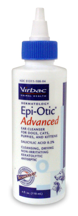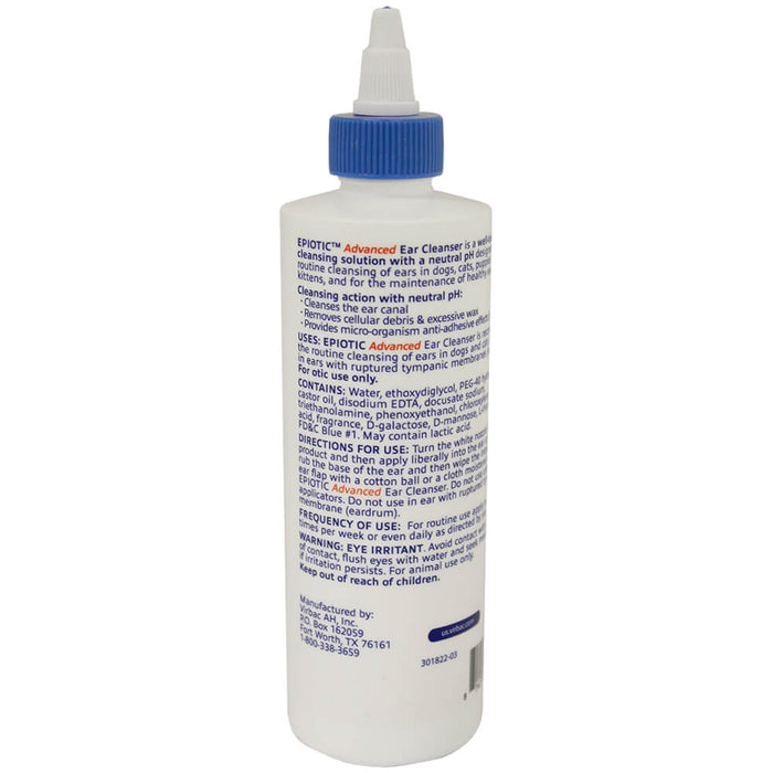 Epi-Otic Advanced Ear Cleanser is specially formulated to address the needs of dogs with sensitive or irritated ears. This gentle yet effective cleanser acts as an antiseptic and drying solution, designed for regular use to maintain ear health. Its neutral pH formula, enhanced with patented anti-odor technology, helps eliminate unpleasant smells by preventing bacterial growth. Ideal for routine ear care or in conjunction with ear medications for chronic otitis externa.