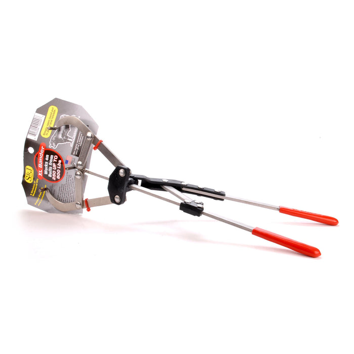 The XL Bander uses large, heavy-duty latex bands that open to 4" x 3" x 3", providing a secure fit for larger bulls. The applicator requires no tightening - simply open the band, position it, and release the handle for a quick and reliable application. In addition to castration, the tool can also be used for horn removal and tail docking.